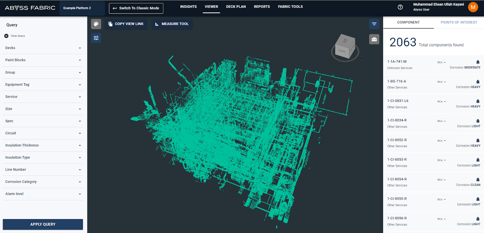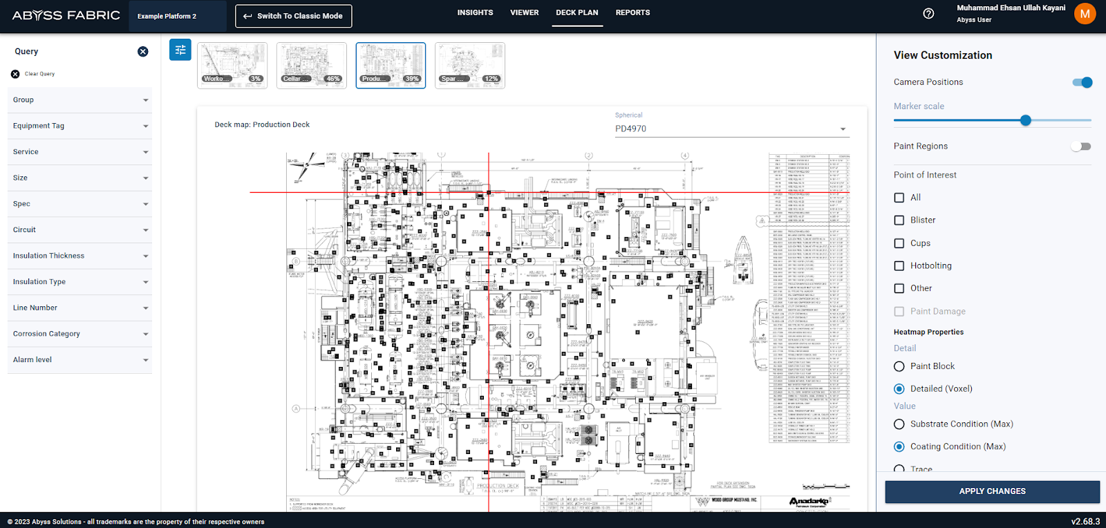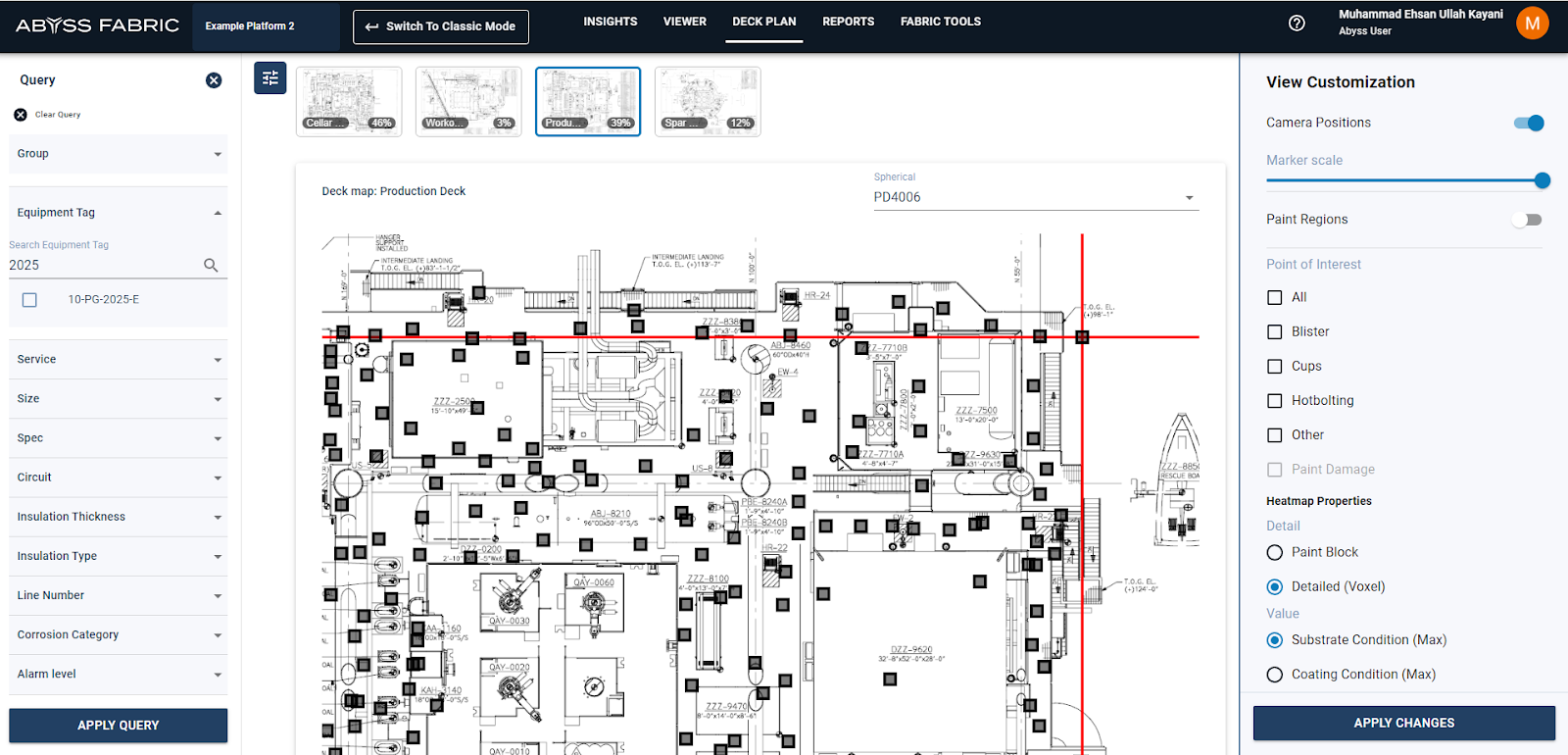 If the user is interested in focusing on the desired query (single asset or assets with similar diameter or service) instead of the entire deck, the user can select the apply query function and then apply changes. This will show the POI markers, heatmaps and camera locations relevant only to the query. The thumbnails of decks in which query does not exist will be grayed out and areas per deck will change correspondingly
