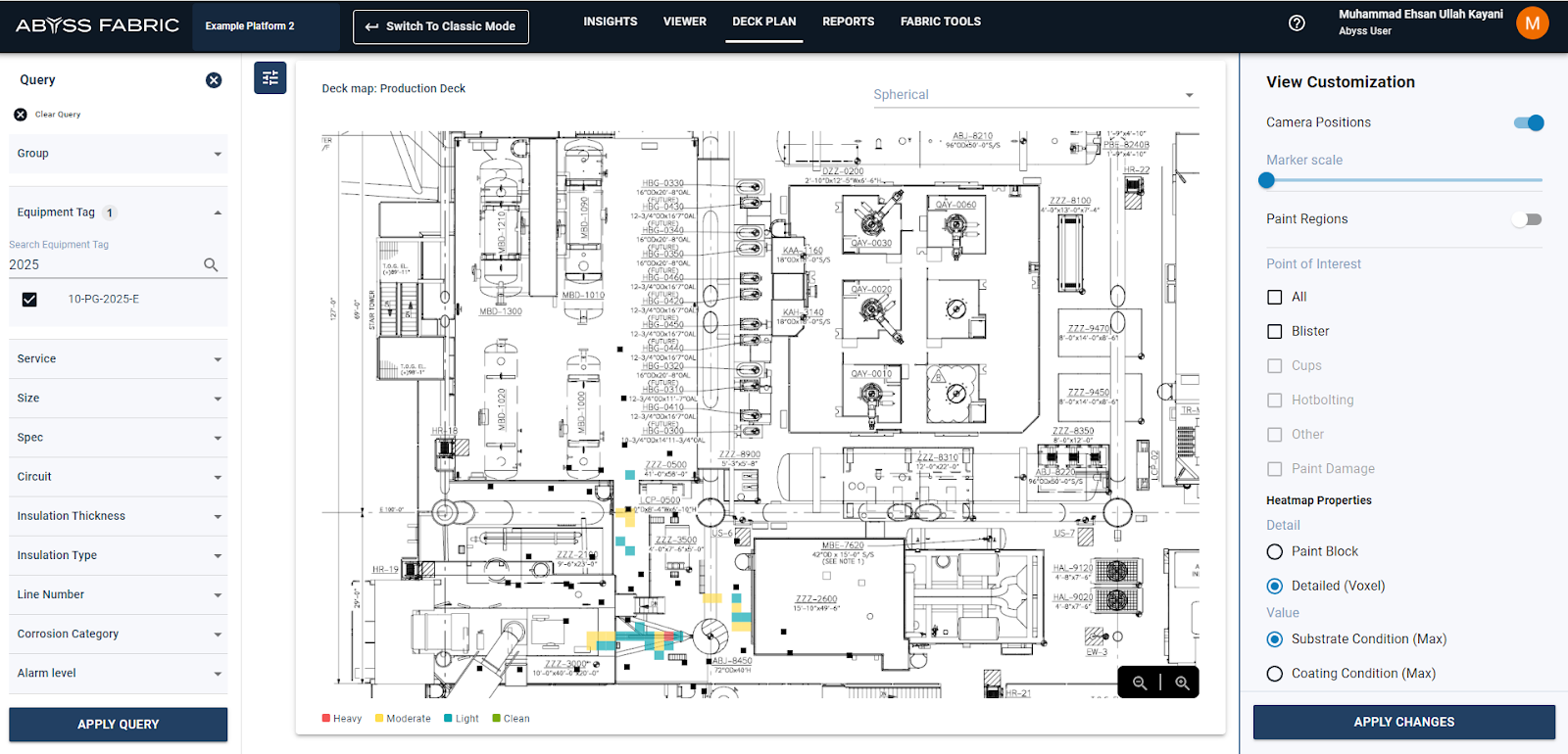 User can apply a heatmap of coating or substrate condition of the entire deck by using detailed (Voxel) option under heatmap properties in the menu on the right and setting the desired option in Value and applying the changes (Blue button Apply Changes on bottom right)